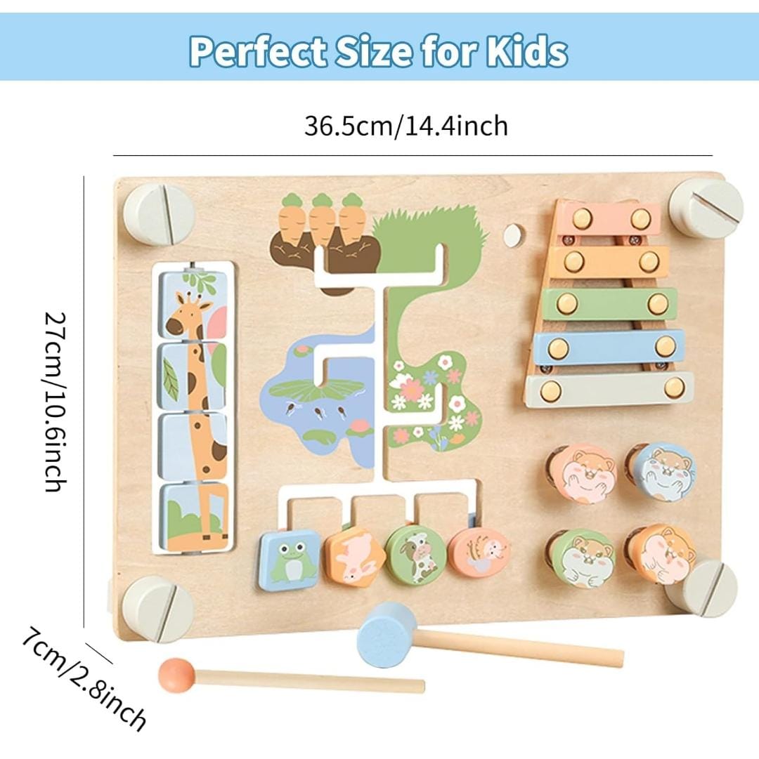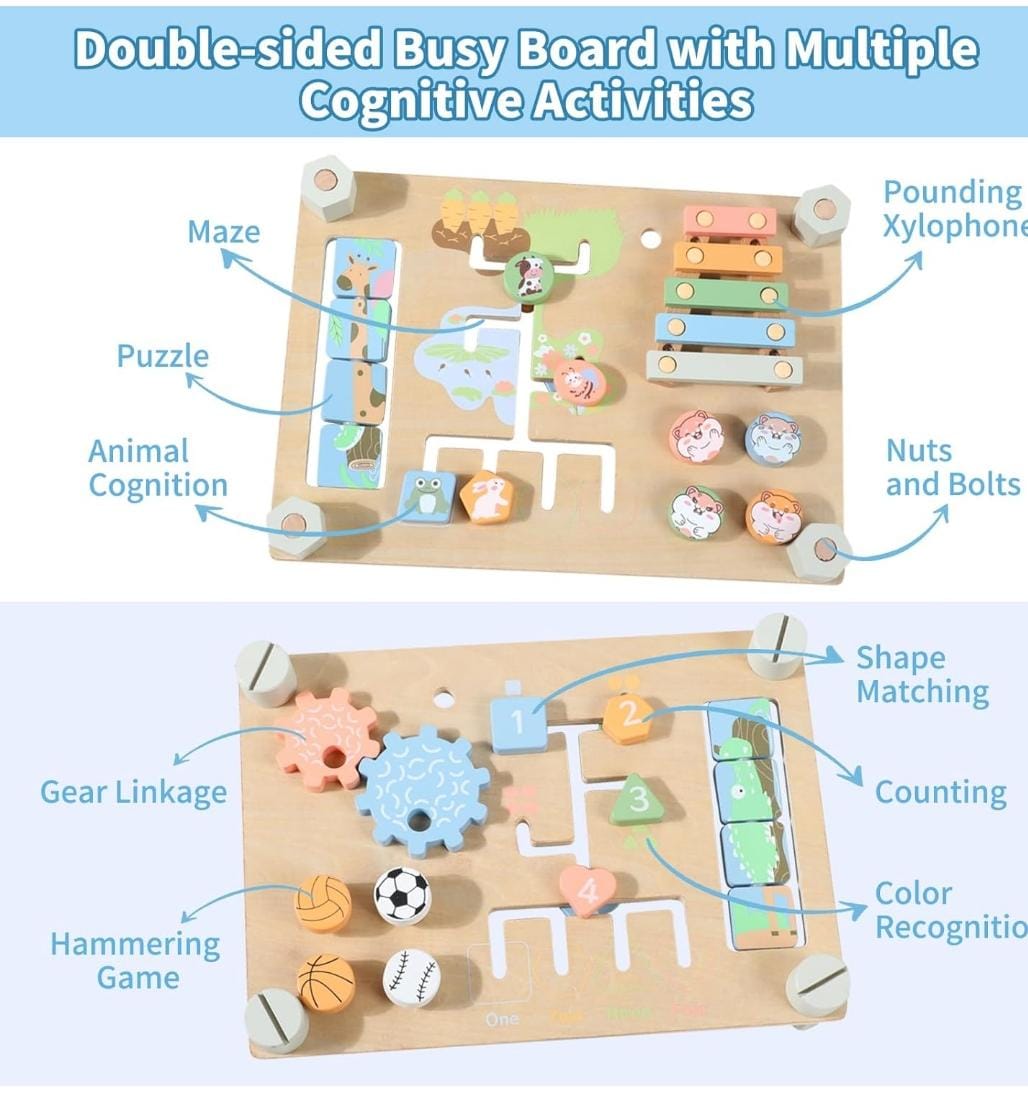 Fun and Challenging Activities: Our Montessori busy board features animal puzzle, xylophone, gears, maze, matching and counting game, hammering game, nuts and bolts. Toddlers will love exploring the sensory and colorful elements while developing cognitive, attention, imagination and learning abilities.